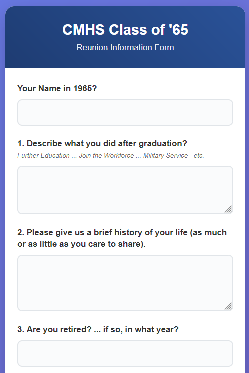 Sorry to disappoint, but there is no catch. Data collection is a free service I'm offering. If your organization has the talent and software available to take the data gathered and manipulate it into a multi-page PDF or spreadsheet to share with reunion members, that's great, and I feel good that I can take a little heavy lifting off your shoulders. If you need help after data is collected, we can talk about that if needed.